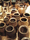 | おもしろいものを御紹介します。 アンティークのギーポットです。 「ギー」とはインドのバター。 それを貯蔵するための木製ポットです。 五十年以上も前のものです。 ヒマラヤの麓、ヒマーチャル・プラデシュ州の産。 地元の様々な木をくりぬいて作ってあります。 だから、形も、大きさも、重さもいろいろ。 あっち向いたり、こっち向いたり、しています。 こんなの、インドにも滅多にありません。 今回は二十四点。 そのうちの半分くらいをちょっとお見せしましょう。 (数字は高さと重さ。到着時の様子はこちら) |