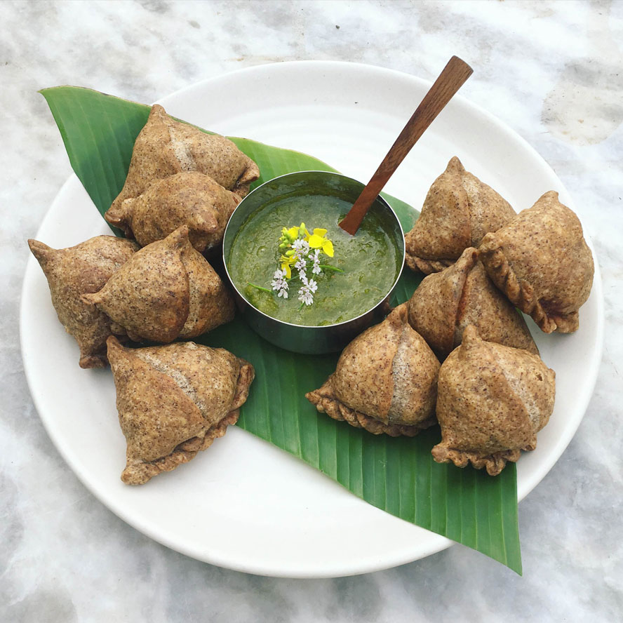 サモサワラ・ティモケのサモサ ヒマラヤ山村で採れる雑穀「シコクビエ」を皮に使って旬の野菜を包みます。新ジャガ、人参、スナップエンドウ、春キャベツなど日替わりで毎日3種類、竹林の庭で揚げたて販売! 5/2−5/5 |