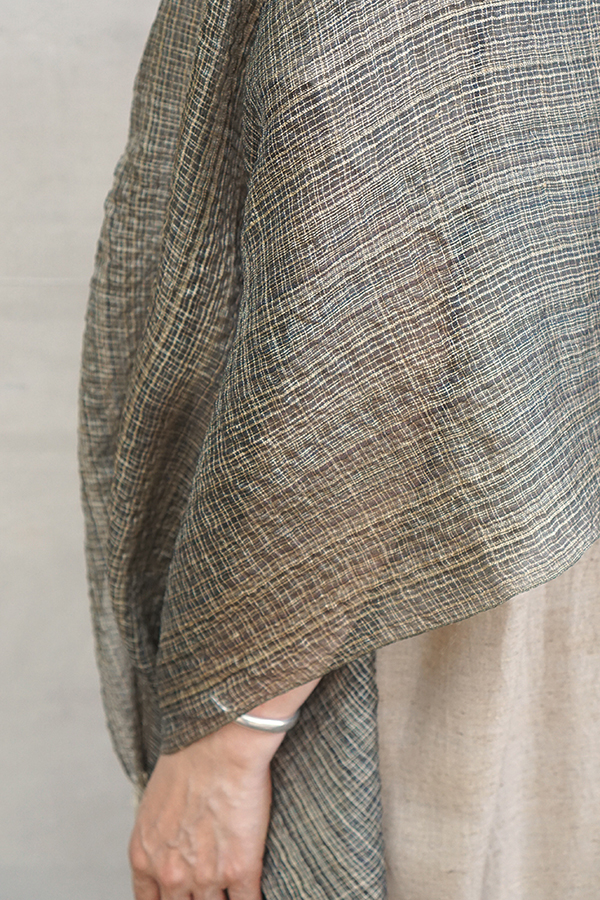 ムガ絹の縮みによって全体的な凹凸感が生まれます。 「黄金のムガ」をふんだんに使いつつ、ガジュマル染めの黒や藍を散りばめたタテ糸は、意外にもシックな表情をしています。