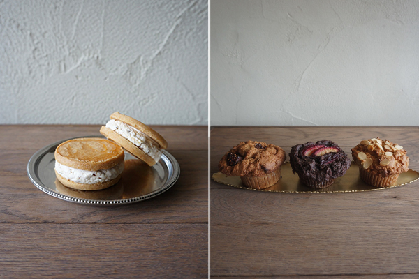 自家栽培の米粉と植物性素材で作るクッキーやマフィン、バターサンドなど。