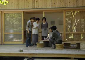 | 雨は風情があるのだが、昨日のはちょっと風情があり過ぎた。 一夜明けて本日7日。 空は一転、晴れ渡る。 一週間ぶりにして、今イベント開始以来初の晴天!! それで記念写真。 上左は入口から望む竹の家。 上右は竹林Shop(左)とチャイ屋(右)。 秋の日差しの清々しい一日であった。 |