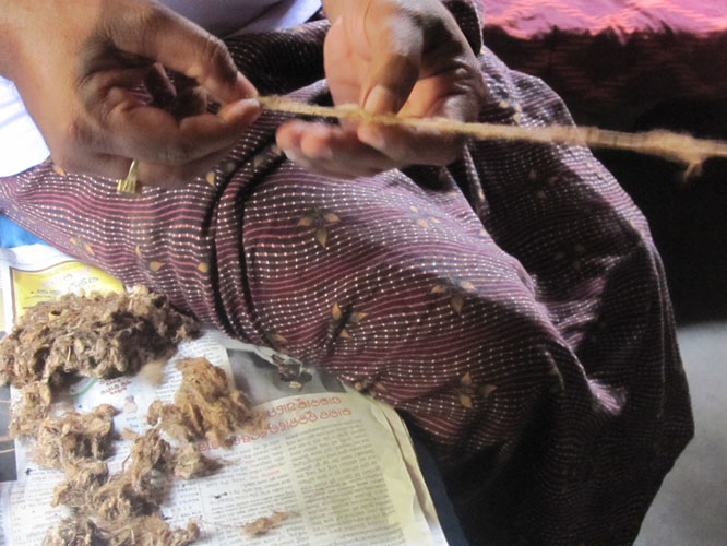 その部分をまとめておいて、そこから紡錘も使わず、手で紡ぎ出すのが、太カティア糸だ。写真13はブラージに太カティア作りを実演してもらったのだが、糸作りは通常、女たちの仕事のようだ。