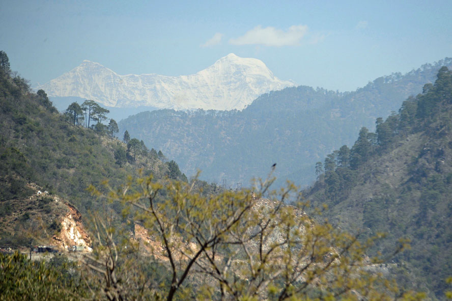 このあたりから、我々のイメージするヒマラヤの高峰が見えてくる。いわゆる「大ヒマラヤ」だ。(写真3)。しかし左上地図を見てもわかるとおり、その手前に小ヒマラヤの山々が幾重にも峰を連ねているので、雪を頂く大ヒマラヤはなかなか拝めない。
